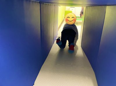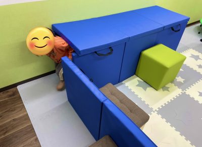 運動マットを使ってトンネル遊びをしています。