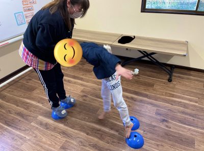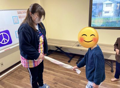 タオルを握って相手との引っ張るタイミングの駆け引きをスタッフと児童で