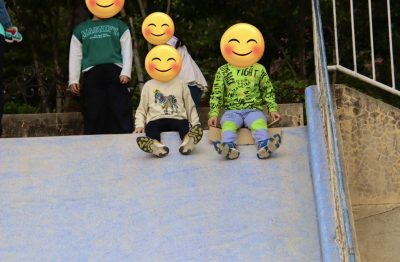 公園では足ったり競争などした後に、急な滑り台があるところで皆で楽しそうに滑りました。