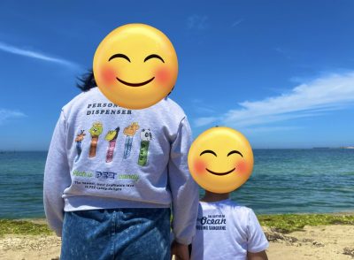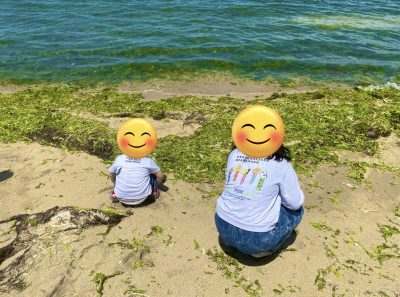 ワカメが砂浜にあるのを見て海に投げて返しています。