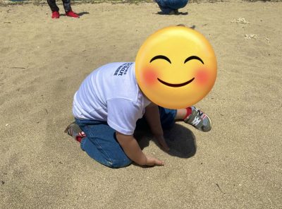 海を初めて見た児童は土遊びのように砂をいじって遊んでいます^^