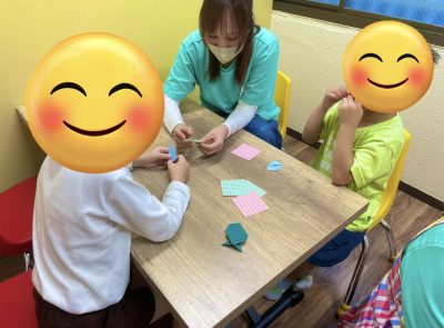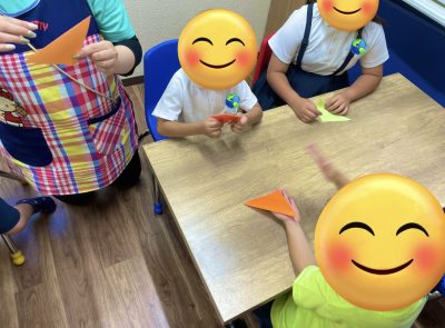 折り紙でサカナを折るのですが、中々折ることができずに奮闘しています。