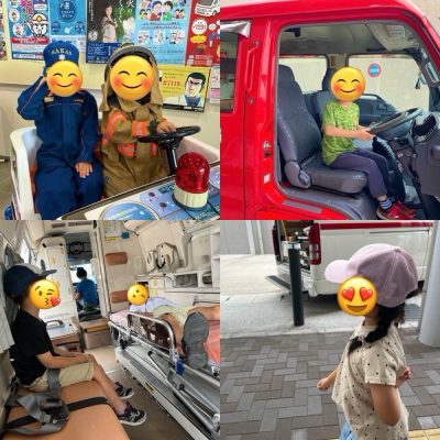 最後には消防士さんの制服を試着して記念撮影をしたり、消防車、救急車の乗る体験もできて児童もテンションが最高潮です😊