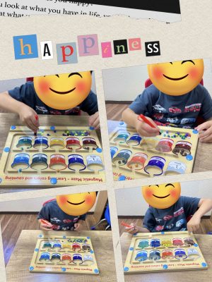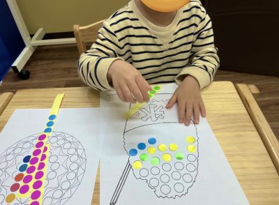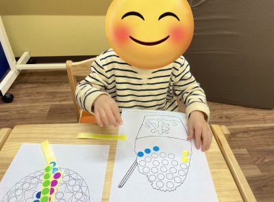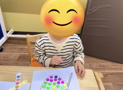 狙いとしてはシールを剥がす(指先の運動)、枠内にシールをはみ出さずに貼るを行っています。