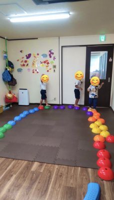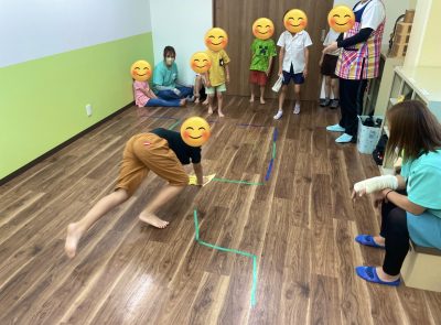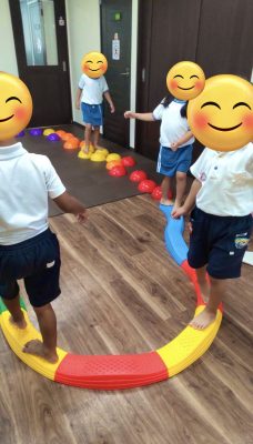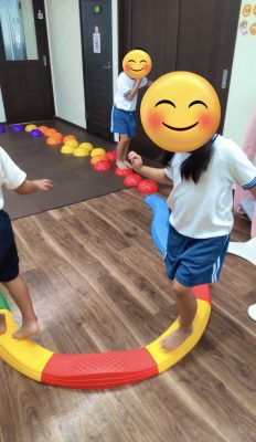 バランスストーン、平均台の上を落ちずに歩く簡単なプログラムをしましたが、未就学の児童は遊び感覚で楽しんでくれています😊