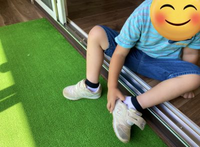 靴脱ぎが苦手な児童はスタッフと一緒に児童が1人で脱ぎ履きができるまで頑張って教えています。