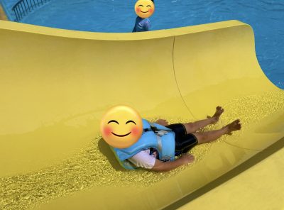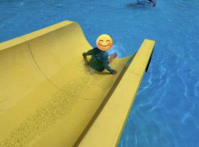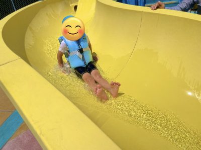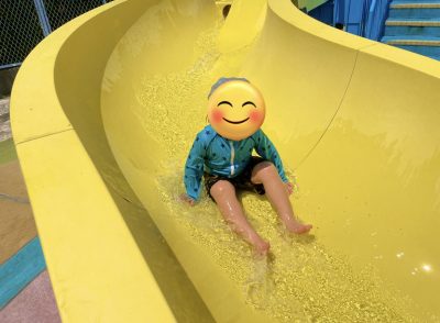 先に目についた流れる滑り台を何回も疲れ知らずで滑っています。