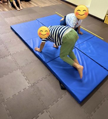 久々の運動マットに未就学の児童はテンションが高く、なかなか落ち着きがなかったですがが、途中からは落ち着いて皆で順番を守りながら楽しみました😊