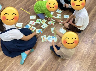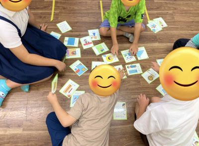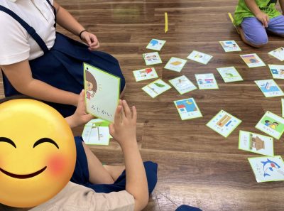最初は反対の言葉の意味が難しく苦戦していましたが、やって行く内に言葉の反対を理解しカードを取っています。