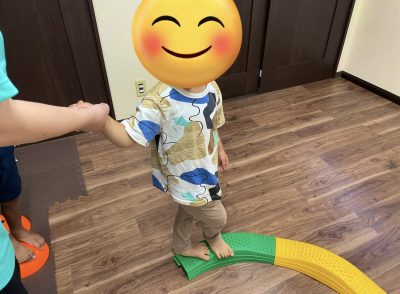 バランスストーン、平均台を使て平衡感覚を掴んでもらっています。