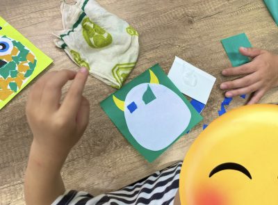 完成品を見ながら作ってくれていますが、ノリをつけたり細かく紙をちぎるのが苦手なので少し悪戦苦闘しながら作業を進めています。
