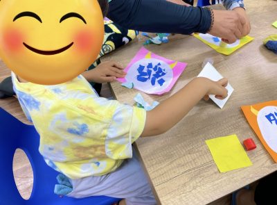 最初は上手にハサミも使えず真っすぐに切る事が出来なかったですが、今では線通りに切る事が出来て成長しています。