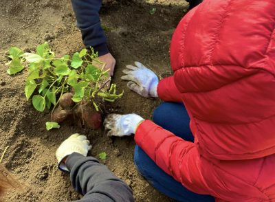 サツマイモ掘りのやり方が分からず戸惑っていましたが、スタッフと一緒に掘る事でコツを掴んだのか1人ででも掘る事が出来ています。