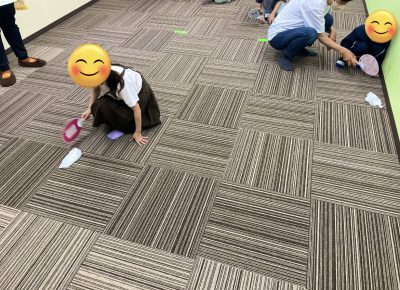 ティッシュを壁まで扇いで運び、壁にティッシュが着いたらスタート位置まで扇いで帰って来るルールと、前回と同じルールで楽しみました。