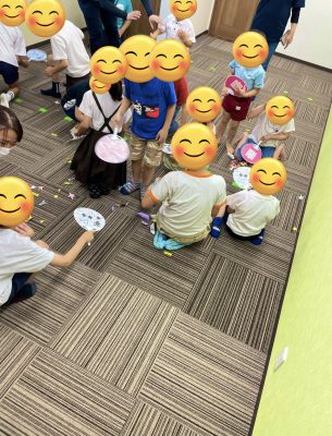 織姫と彦星にちなんで天の川に星を貼ってもらい作品を皆で完成させるゲームを行いました。