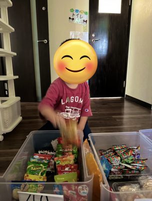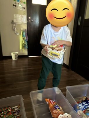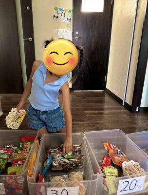 皆にはお金の計算が出来るように何円のお菓子を取ったのか自分で計算してもらい、お買い物した感覚で行ってもらっています。