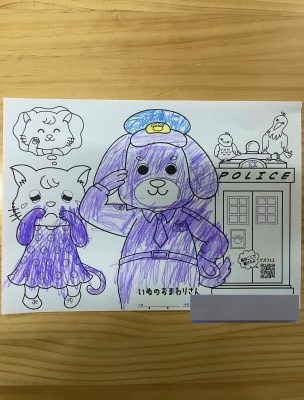 ぬり絵で、犬のおまわりさんを塗りました。