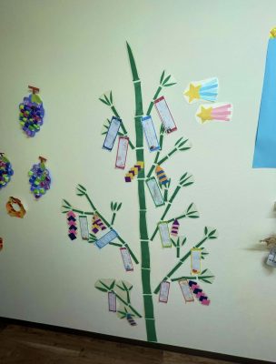 教室では七夕に皆で短冊に願い事を書いて壁の方に飾っています。