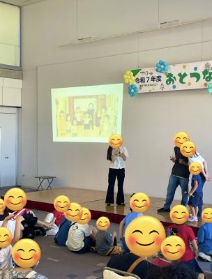 前のステージには桃山学院大学の生徒さんが絵本を読んだり、映像に合わせてのお話しをしてくれているのを児童も楽しそうに聞いています。