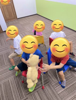 音楽がなっている間は、ぬいぐるみを右隣りの人に回していき、音楽が止まると持っている児童の所でアウトのゲームをしました。