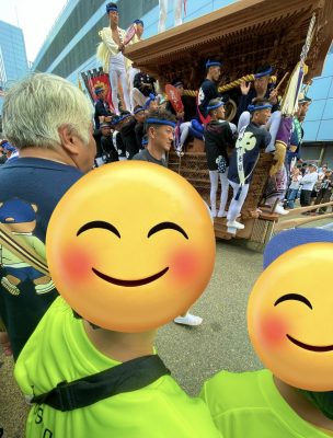 休憩している合間にだんじりと記念撮影や走っているだんじりを間近で見たりと大迫力のだんじり見物が出来て児童も大満足な様子です🥳