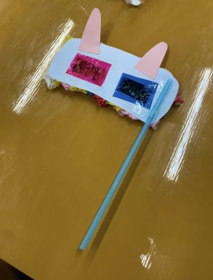 作り方は簡単なので児童には自分が好きなように目、角、色を付けてもらい最後に持ちての方にストローを付けたら仮面の完成です。
