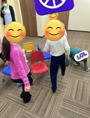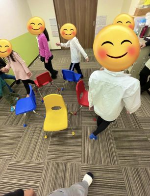 音楽が止まったら座る普通のルールのゲームですが、椅子に座りたいと椅子の近くをゆっくり歩いたり回ろうとする児童もいるので、椅子の周りを大きく回る、一定の歩きをするなどのルールを追加しながらゲームを楽しんでいます🥳