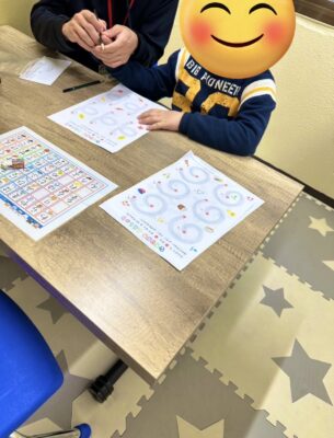 ペンの持ち方は児童になぞり線をなぞってもらい、ペンの持ち方が一人でもできそうな児童は1人で出来る所まで頑張ってもらい、持ち方が崩れそうならスタッフと一緒に頑張っています。